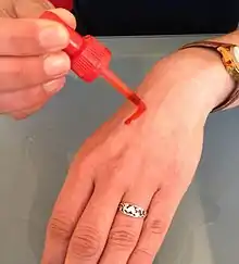 Lavar la herida con agua, agua con jabón, o a falta de alguna de las anteriores, con la misma Mercromina en abundante cantidad, y posteriormente secar. Con el cuentagotas recubrir la herida y sus bordes. Dejar unos minutos para asegurar su fijación, quitar el exceso con gasa o algodón sin tocar la herida. Se recomienda aplicar 2-3 veces por día.[1]