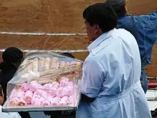 El merenguero lleva una charola con los postres, y también carga una mesita plegable.