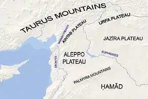La meseta de Alepo se encuentra en el norte de la conjunción téctonica de la placa arábiga y la placa africana (el denominado Rift de Mar Muerto).