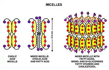 Estos triglicéridos, no pueden ser absorbidos por el intestino.[16][17] Sino que son degradados a mono y diglicéridos más ácidos grasos líbres (aunque no glicerol libre) por la lipasa pancreática, la cual forma un complejo 1:1 con una proteína llamada colipasa (también constituyente del jugo pancreático), la cual es necesaria para su actividad. El complejo activado funciona únicamente en la interfaz agua-grasa. Por lo que es esencial que las grasas, primero se encuentren emulsificadas por las sales biliares para la actividad óptima de estas enzimas.[18] Los productos de la digestión consisten en una mezcla de tri, di y monoglicéridos más ácidos grasos libres, los cuales junto con otros contenidos liposolubles de la dieta (por ejemplo vitaminas liposolubles y colesterol) y las sales biliares forman micelas mezcladas, en el contenido acuoso duodenal (ver el diagrama a la izquierda).[19][17]