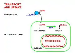 - Los ácidos grasos de cadena larga entran a las células que van a metabolizarlos (la mayor parte de las células del organismo excepto glóbulos rojos y neuronas del sistema nervioso central) a través de proteínas transportadoras específicas, tales como la familia de proteínas transportadoras de ácidos grasos SLC27.[5][6] Los glóbulos rojos no contienen mitocondrias, y por lo tanto no pueden metabolizar ácidos grasos, los tejidos del sistema nervioso central no pueden hacer uso de los ácidos grasos, a pesar de que contienen mitocondrias, porque los ácidos grasos no pueden cruzar la barrera hematoencefálica hacia el fluido intersticial que baña a estas células.