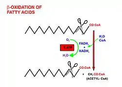 - La beta oxidación, en la matriz mitocondrial, finalmente corta las largas cadenas carbonadas de los ácidos grasos (en la forma de moléculas de acil-CoA) en una serie de unidades de acetato, las cuales, combinadas con coenzima A forman moléculas de acetil-CoA, las que a su vez se condensan con oxaloacetato para formar citrato al comienzo del ciclo del ácido cítrico.[2] Resulta conveniente pensar en esta reacción como en el punto de inicio del ciclo, ya que es el punto donde el ciclo es alimentado con acetil-CoA, cuyo grupo acetato será disipado como CO