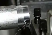 El torneado es un proceso de corte de metales para producir una superficie cilíndrica con una herramienta de una sola punta. La pieza de trabajo gira sobre un husillo y la herramienta de corte se introduce en ella de forma radial, axial o ambas. La producción de superficies perpendiculares al eje de la pieza se denomina refrentado. La producción de superficies utilizando tanto el avance radial como el axial se denomina perfilado.[3]