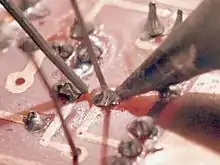 La soldadura fuerte es un proceso de unión en el que un metal de aportación se funde y se introduce en una capilar formada por el ensamblaje de dos o más piezas de trabajo. El metal de aportación reacciona metalúrgicamente con las piezas de trabajo y se solidifica en el capilar, formando una unión fuerte. A diferencia de la soldadura, la pieza no se funde. La soldadura fuerte es similar a la soldadura blanda, pero se produce a temperaturas superiores a 450 °C (842 °F). La soldadura fuerte tiene la ventaja de producir menos tensiones térmicas que la soldadura, y los conjuntos soldados tienden a ser más dúctiles que los soldados porque los elementos de aleación no pueden segregarse y precipitarse.