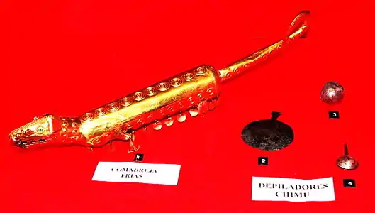 Los objetos variaban entre simples adornos, herramientas, instrumentos musicales, así como una gran variedad de armas cortantes. Algunos objetos decorativos eran diseñados de una manera muy elaborada y encontrados de manera habitual en mausoleos y criptas relacionadas con personajes de alto nivel social. Por esta razón, se cree que los metales se consideraban como un producto altamente valioso, el cual era utilizado para cuestiones tan cotidianas como las herramientas, así como para muchos propósitos religiosos o sociales. Se sabe que el uso del oro y la plata era muy extendido, debido a la gran cantidad de objetos sustraídos durante la Conquista del Perú y durante la posterior explotación durante la Colonización española de América. Bronce de arsénico[8] era también obtenido de minerales sulfurosos, una práctica que se desarrolló de manera independiente o se aprendió de la tradición del sur.