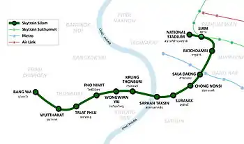 La línea BTS Silom (verde oscuro) tiene 14 estaciones (una de ellas de intercambio, Siam) y un trazado total de 14,2 kilómetros.[9]