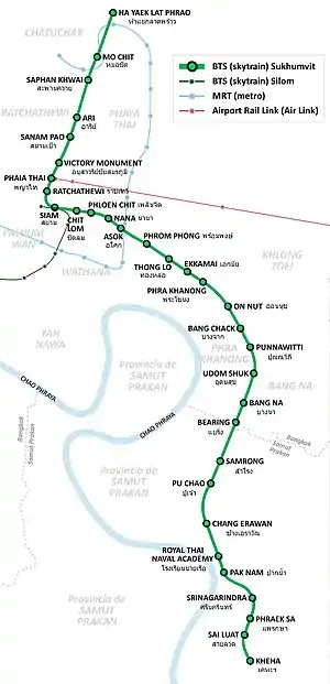 La línea BTS Sukhumvit (verde claro) tiene 32 estaciones (una de ellas de intercambio, Siam) y un trazado total de 36,6 kilómetros.[9]