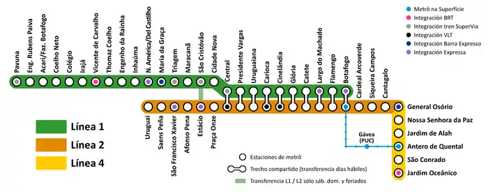 La Línea 1, con un flujo de 300 mil pasajeros por día, tiene 19 estaciones y 16 kilómetros de vías. La Línea 2, con un flujo diario de 250 mil pasajeros, contaba con 15 estaciones y 24,9 kilómetros de vías,[1] pero en noviembre de 2010 se inauguró la estación número 16, Cidade Nova, y se amplió la extensión de la línea con un trecho de diez estaciones en el que el tendido férreo es compartido con la Línea 1 (las estaciones Central, Presidente Vargas, Uruguaiana, Carioca, Cinelândia, Glória, Catete, Largo do Machado, Flamengo y Botafogo funcionan desde entonces como intercambiadoras, con lo que es posible viajar desde Botafogo hasta Pavuna sin cambiar de coche).[25][26][27] De esta manera, la Línea 2 incorporó esas diez estaciones compartidas a su trayecto y alcanzó un total de 26 estaciones y 30,2 kilómetros de vías.[1]
