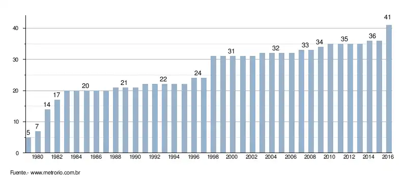 El Metro de Río de Janeiro (en portugués: metrô do Rio de Janeiro) es una red del ferrocarril subterráneo masivo que sirve a la ciudad de Río de Janeiro, Brasil. Fue inaugurado en 1979 con cinco estaciones que funcionaban en una línea. Incluye 41 estaciones, 57 kilómetros de vías operativas[4] y tres líneas (Línea 1 -Naranja-, Línea 2 -Verde- y Línea 4 -Amarilla-) que transportaron en 2016 un promedio de 942 mil pasajeros diarios.[5] Desde diciembre de 2009, Estácio dejó de ser la estación exclusiva de transferencia entre ambas líneas a partir de la creación de la conexión directa entre las líneas 1 y 2 a lo largo de diez estaciones, entre Botafogo y Central, las cuales funcionan como intercambiadores.[6][7] Desde 2016 la Línea 4 funciona como extensión de la Línea 1 hacia el oeste de la ciudad.