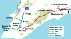 El Metro de Salvador, oficialmente Sistema de Metro de Salvador y Lauro de Freitas (SMSL),[4] es el sistema metropolitano de las ciudades de Salvador y Lauro de Freitas, en el estado de Bahía, y operado por la CCR Metro Bahía.[3] Actualmente, restringido a la capital baiana, el sistema funciona en operación asistida con el trecho activo entre Acesso Norte y Lapa, de la línea 1, en un total de 6,6 kilómetros y cuatro estaciones. También este año, en julio, la estación del Retiro se suma a las otras ampliando el recorrido hasta los 7,3 kilómetros y cinco estaciones, y cuya operación comercial comenzará en septiembre.[5][6]