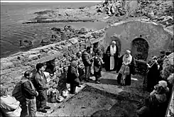 El metropolitano Cirilo realizando un servicio en la iglesia en ruinas en Kardamos en la isla de Imbros | ||