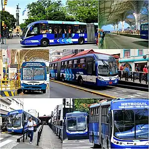 ![]() De izquierda a derecha y de arriba abajo: Bus articulado saliendo de La Plaza del Centenario, Terminal Bastión Popular, Terminal del Guasmo, Parada Boca 9 con nuevo articulado, Bus de la metrovía antiguo y buses de Metroquil y Metrobastión en Biblioteca Municipal. | ||