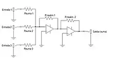 Estos sencillos sumadores aditivos se basan en la ley de Kirchoff que suma en un nodo la corriente que aporta cada entrada, (correspondiente a la resistencia de cada una). Solo suma las amplitudes y la salida solo contiene las frecuencias de las señales originales.[3]