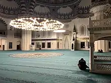 Dos enormes candelabros cuelgan de los domos que han sido decorados con artesanías otomanas. La mezquita tiene un domo de 37 m de alto: 23 m de diám por dentro y 25 m por fuera. Se utilizó mármol blanco de Turquía para la construcción.[6]