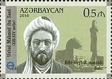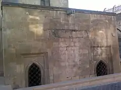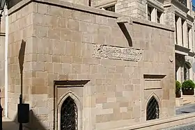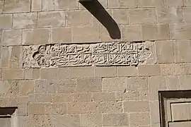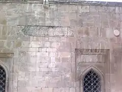 En la parte superior de la mezquita hay una inscripción en árabe. La escritura de dos líneas ofrece información detallada sobre la fecha de construcción de la mezquita, su cliente y el arquitecto, que desempeñó un papel activo en la construcción de edificios y estructuras militares, religiosos y conmemorativos. En sus obras, se observa la influencia del período de los Shirvanshah.[4]