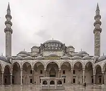 Al igual que otras mezquitas imperiales en Estambul, la mezquita es precedida por un monumental patio (avlu) en el lado oeste. El patio está rodeado por una columnata o peristilo con columnas de mármol, granito y pórfido. Situadas en las cuatro esquinas del patio se encuentran los cuatro minaretes, un número solo permitido a las construcciones del sultán pues las de los príncipes y princesas podían tener solo dos alminares o minaretes. Los minaretes tienen un total de diez galerías (serifes) los cuales indican que el Sultán era el décimo de la dinastía otomana.