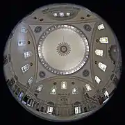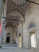 La planta interior de la mezquita es una simple sala cuadrada, de 24,5 m de cada lado, cubierta por una cúpula poco profunda de 32,5 m de altura.[4] Al igual que con Hagia Sophia, la cúpula es mucho menos profunda que un hemisferio completo. Las ventanas están decoradas con lunetos de teja seca policromada . Al norte y al sur de la sala principal, pasajes cupulados conducían a cuatro pequeñas salas también cupuladas, que estaban destinadas a funcionar como hospicios para los dervishes viajeros.