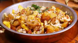 Cortar las cebollas y freírlas en una cacerola con aceite de oliva a fuego medio-bajo hasta que estén bien hechas. Luego agregar las papas, peladas y cortadas en dados pequeños, sazonar con comino, salpimentar y agregar un cuarto de taza de agua hervida. Cocinar a fuego lento hasta que las papas estén tiernas, pero no hayan perdido su forma. Los huevos batidos se vierten sobre las papas y se agitan suavemente hasta que todo el huevo esté cocido; se guarnece con las hojas de cilantro agregan antes de servir.