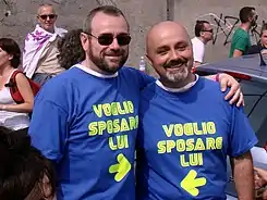 - Esta obra contiene una traducción derivada de «My Big Gay Italian Wedding» de Wikipedia en inglés, publicada por sus editores bajo la Licencia de documentación libre de GNU y la Licencia Creative Commons Atribución-CompartirIgual 3.0 Unported.