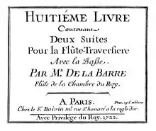 - 1694 . Premier Livre des Trio, pour les violons, Flûtes et hautbois, par Monsieur De La Barre, Flûte de la Chambre du Roy, París, Christophe Ballard, 1694.