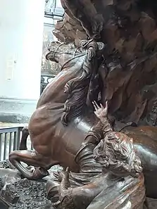 En el exterior de la iglesia de San Pablo de Amberes hay un grupo de estatuas conocido como el Calvario. Fue creado en el lugar de un antiguo cementerio dominicano por los hermanos van Ketwigh, que eran frailes dominicos. Su diseño data de 1697. En 1734 se terminó la construcción del calvario, pero se fueron añadiendo más estatuas hasta 1747. Está construido como un patio y se apoya en uno de sus lados en la nave sur de la iglesia y en la capilla del Santísimo Sacramento. La estructura incluye 63 estatuas de tamaño natural y nueve relieves ejecutados en un estilo popular y teatral. La mayoría de las estatuas son de piedra blanca y algunas son de madera. Algunas estatuas están fechadas o firmadas. Los principales escultores fueron Michiel Van der Voort el Viejo, Alexander van Papenhoven y Jan Claudius de Cock con algunas estatuas de la mano del padre y del hijo, Willem Kerricx, Jan Pieter van Baurscheit de Elder y colaboradores anónimos.[15] Las estatuas están dispuestas en cuatro grupos: el camino de los ángeles, que asciende al Santo Sepulcro, el jardín de los profetas a la izquierda, el jardín de los evangelistas a la derecha y el Calvario propiamente dicho, que consiste en una roca artificial elevada, dividida en tres terrazas, en las que se colocan las estatuas con Cristo en la cruz en la parte superior.[16] Los ángeles del Calvario se inspiran directamente en los ángeles realizados por Bernini para el Puente Sant'Angelo de Roma en 1657.