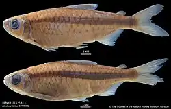 - Esta obra contiene una traducción derivada de «Micralestes vittatus» de Wikipedia en catalán, publicada por sus editores bajo la Licencia de documentación libre de GNU y la Licencia Creative Commons Atribución-CompartirIgual 3.0 Unported.
