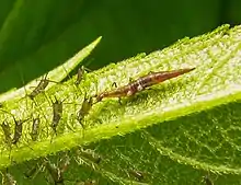 Larva campodeiforme de Micromus alimentándose de pulgones.