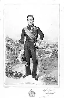 ![]() Miguel López de Baños, litografía de Domingo Valdivieso y Henarejos para Estado Mayor General del Ejército Español de Pedro Chamorro (1852) y facsímil del autógrafo. | ||