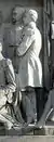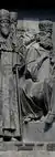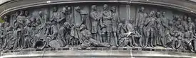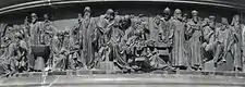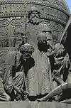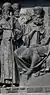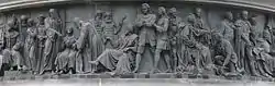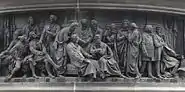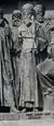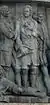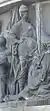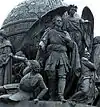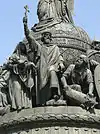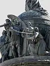 ![]() | Llegada de los varegos a la Rus | Призвание варягов на Русь | 862 | Riúrik, fundador del primer Estado ruso y primer príncipe de Nóvgorod, con casco terminado en pico, espada y escudo, en el que se ve una pequeña cruz bizantina y la inscripción «Лета STO» (cifra en numeración griega: año 6370 del calendario bizantino, que corresponde al año 862 del calendario gregoriano). Atrás de la figura del príncipe se encuentra la imagen del dios pagano eslavo Veles. Esta composición se encuentra ubicada en dirección sur, mirando hacia Kiev. |