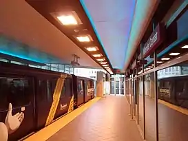 La estación Millender Center está en el nivel 5 del edificio Millender Center. Cuenta con una plataforma lateral. Sus componentes fueron preelaborados en Ohio y se enviaron por pieza a Detroit, lo que redujo la duración de la obra.[1]