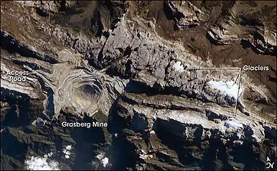 ![]() Vista de la excavación a cielo abierto de la mina Grasberg. | ||