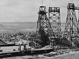 ![]() Castilletes de Anaconda con vistas a la ciudad de Butte. Foto de HAER | ||