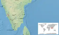 Es endémica de los Ghats occidentales en Kerala y Karnataka (India). Su rango altitudinal oscila entre 40 y 200 msnm.