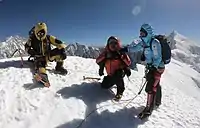 Tenjing Sherpa, Mingma Sherpa y Sophie Lavaud (de izquierda a derecha) en la cima del Kyungya Ri 2