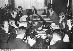 ![]() Apertura del tráfico telefónico directo en Berlín y Tokio el 12 de marzo de 1935: en el centro de la mesa, el Ministro de Transporte del Reich, Eltz-Rübenach , a la izquierda junto a él, el Embajador Mushakoij, justo a su lado, el Ministro de Relaciones Exteriores Neurath y el Reichsleiter A. Rosenberg. | ||||