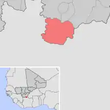 Se encuentra ubicada al sur del país, junto a la frontera con Burkina Faso y Costa de Marfil y al sureste de la capital nacional, Bamako.