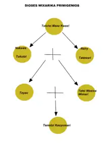 Con un papel primordial se encuentra la deidad suprema llamada Tututzi Maxa Kwaxi (Nuestro bisabuelo Cola de venado), quien encabeza el árbol genealógico de los dioses y espíritus mitológicos, esta deidad suprema representa el universo mismo, la esencia que se encuentra en cualquier substancia material o inmaterial. Tututzi tiene dos deidades que le siguen en importancia, y estas son la pareja primordial y divinal; el dios del fuego primigenio (Nairy) y la diosa de la tierra (Takutzi Nakawe) cuyo significado es "Nuestra abuela tierra".