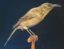 Era común en los bosques subtropicales de la isla hasta el siglo XX cuando comenzó su declive. Su canto se escuchó por última vez en 1987 y desde entonces ha sido declarada extinta. Las causas de su extinción son la introducción de la rata negra (Rattus rattus), el cerdo doméstico y los mosquitos portadores de enfermedades aviares (malaria aviar, Plasmodium relictum, y la viruela aviar, Poxvirus avium), así como la destrucción de su hábitat.[3]