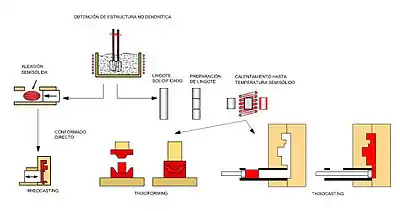 Para aleaciones de aluminio los procesos habituales son: el “reomoldeo” y “tixomoldeo”.[5]Otros procesos tales como el SIMA (strain induced melt activation) o RAP (Recrystallisation and Partial Melting) también pueden ser utilizados en aleaciones de aluminio, sin embargo son comercialmente menos comunes. En el caso de aleaciones de magnesio el sistema más común es el tixomoldeo.[6]