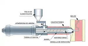 El tixomoldeo desarrollado específicamente para aleaciones de magnesio, usa una máquina similar a la de moldeo por inyección. En un proceso continuo, la aleación de magnesio, a temperatura ambiente en forma de pelets, es cargada por la parte de atrás de un barril caliente a través de una tolva de alimentación. El barril se mantiene en atmósfera de argón para prevenir la oxidación del material peletizado. Un tornillo sin fin localizado dentro del barril empuja los pelets de magnesio adelante a medida que son calentados hasta el estado semisólido. La rotación del tornillo proporciona la fuerza de cizalla necesaria para generar la estructura globular requerida en la fundición en estado semisólido. Una vez se haya acumulado suficiente material, el tornillo se adelanta para inyectar el lodo obtenido dentro de una matriz de acero.[8]