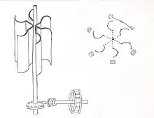Otra inventiva relevante consiste en el deflector en forma de puerta corredera semicircular, que se orienta automáticamente con el viento. Mediante este deflector, es posible aumentar considerablemente la fuerza realizada por el molino para un viento dado [5].