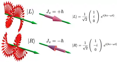 Cuando un haz de luz está polarizado de forma circular, cada uno de sus fotones trasporta un momento angular de rotación —que aquí lo denominamos espín— de , donde es la constante reducida de Planck y el signo es positivo para las polarizaciones levógiras y negativo para las dextrógiras —es la convención más usada en la óptica—. Este momento angular de espín de la luz está orientado en la misma dirección que el eje de propagación. En la figura se puede apreciar como se componen los campos eléctrico y magnético, y muestra la dirección de propagación con una flecha verde.