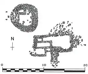 En el lado Norte de la estructura oval, se halló un paquete de ofrendas envuelto en un textil de lana color marrón claro. El envoltorio contenía dos pares de sandalias, dos bolsas de textil pequeñas, una olla con pedestal, un frasco pequeño, un par de platos de cerámica, un plato de madera, una cuchara, un peine, alimentos como maíz y chile, y carbón vegetal. [1]