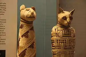 Los gatos fueron momificados como ofrendas religiosas en cantidades enormes y se creía que representaban a la diosa del hogar y la maternidad Bastet o diosas leonas como Pajet o Sejmet. Este culto se centró principalmente en Tebas y Beni Hasan y en las catacumbas de Saqqara, en la década de 1880 se encontraron unas 200.000 momias de animales momificados.[13] Los gatos que eran criados para convertirse en ofrendas de este tipo por lo general murieron debido a la estrangulación o la ruptura de sus cuellos. Durante la momificación, los cuerpos de los gatos se secaban y se rellenaban con arcilla, arena o algún otro tipo de material de embalaje. Eran colocados con sus extremidades dobladas cerca de sus cuerpos o en una posición sentada más realista. La envoltura generalmente se completaba a través de intrincados patrones geométricos. Al inicio del desarrollo de la momificación animal, las momias de gato se colocaron en pequeños sarcófagos de bronce o de madera. Las momias más caras generalmente estaban adornadas con rasgos dibujados en pintura negra y ojos de vidrio coloreado, obsidiana o cristal de roca. Los gatitos y los fetos eran momificados y enterrados dentro del vientre de una estatua que representaba a su madre. Con el paso del tiempo, como todas las momias diseñadas para este propósito, la momificación se hizo menos precisa. De hecho Terence Morrison-Scott, exdirector del Museo Británico de Historia Natural, desenvolvió una gran cantidad de momias de gatos, pero descubrió que muchas de ellas estaban simplemente rellenas con partes de cuerpos aleatorios de gatos y no se momificaban con cuidado detallado.