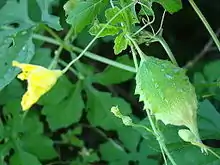 Es una planta trepadora anual ramificada glabra,con zarcillos y monoica. Tallos pubescentes a glabrescentes. Hojas orbiculares, de 1.5-5.0 (-12.0) cm de largo y ancho, cordadas, glabras o escasamente peludas, de 3 a 5 lóbulos, lóbulos medio ampliamente ovado o romboidal -ovado, sinuoso-dentado o lobulado agudo. Pecíolo con 1-3 cm de largo, pubescente. Flores amarillas, de 2.5-3.0 cm de diámetro, pediceladas. Las flores masculinas solitarias, de 1,5 (-7) cm de largo pedúnculo, teniendo cerca de la punta de sésiles brácteas, ampliamente ovado-cordadas, subglabras, dentadas, flores femeninas de 5-15 mm de largo. Tubo del cáliz de 5-6 mm de largo, pubescente, lóbulos ovales, acuminados, 3-3.5 mm de ancho. Corola poco zigomorfa, marrón en la base, lóbulos amarillos, obovadas, largas 10-15 mm, 8-10 (-12) mm de ancho. Fruto ampliamente ovoide, estrechado en los extremos, 2-7 cm de largo, 1-2.5 cm de ancho, de color rojo anaranjado, tuberculado. Semillas elíptico-ovadas, 1-1.2 cm de largo, 6-7 mm de ancha.[1]