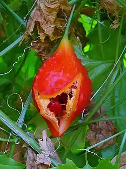 Momordica balsamina es una planta anual trepadora nativa de las regiones tropicales de África, introducida e invasiva en Asia, Australia, América Central y México Tiene color amarillo pálido, con flores profundamente veteadas y redondas, algo verrugosas, y frutas de color naranja brillante. Cuando están maduros, los frutos estallan, revelando numerosas semillas cubiertas con una capa escarlata brillante, muy pegajosa. Fue introducida en Europa por 1568 y se utiliza con fines medicinales para tratar heridas. En 1810, Thomas Jefferson plantó esta vid en sus fronteras de flores en Monticello con espuela de caballero, amapolas , y la nuez moscada.