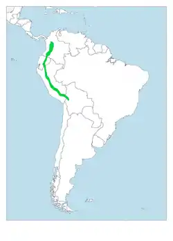 Se distribuye a lo largo de los Andes desde el noroeste de Colombia, por Ecuador, Perú, hasta el extremo norte de Bolivia.[5]