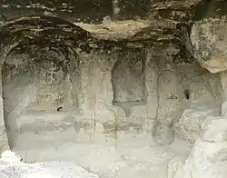 El complejo monástico consiste en ocho edificaciones en fila, con una iglesia localizada en el medio, en la parte más cóncava de la curva del macizo de roca. La iglesia tiene una planta de tres naves y se orienta según el canon de oeste a este, las partes sur y suroeste se encuentran totalmente destruidas. La presencia de un baptisterio demuestra que el templo no solo se usó para el ritual monástico, sino que también se oficiaron liturgias públicas. En la parte noroeste del monasterio, hay una segunda planta, que alberga otro centro importante del monasterio, que presumiblemente se utilizaba como refectorio. En la parte oeste del monasterio se encuentra otro edificio utilizado como claustro, donde también se encuentran las celdas de los monjes, la cocina, la bodega y la despensa.[2] También se pueden ver dos aljibes.