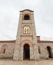 El campanario recientemente construido junto al monasterio. Un ícono sobre la entrada ilustra a San Clemente junto a San Pantaleimon, mientras Cristo los observa.