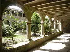 El claustro del monasterio, del siglo XVI, tiene dos alturas y tres alas que recuerdan a las del monasterio del Lérez. De planta rectangular, es de estilo barroco clásico, compuesto por arcos semicirculares que se apoyan sobre columnas exentas sobre un podio corrido.